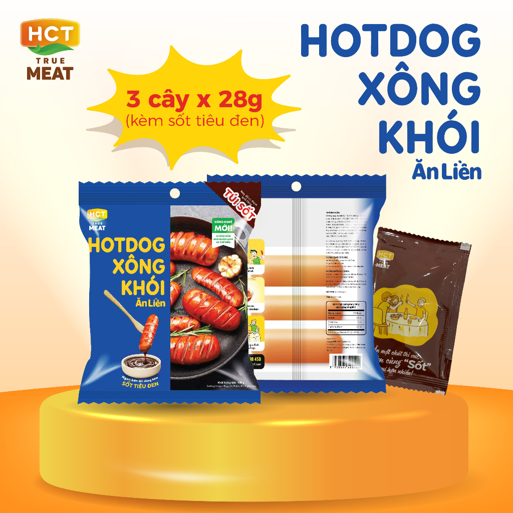 Túi 3 cây Xúc xích Hotdog xông khói ăn liền HCT True Meat kèm sốt tiêu đen 28g x 3 cây